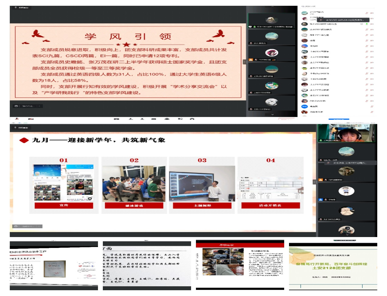 本次大赛主题为“奋楫笃行开新局,百年奋斗创辉煌”,共分为现场答辩和评委提问两个部分。22支团支部队伍幷驱争先,在答辩的五分钟时间内,展现各支部的风采。虽然受疫情影响,团支部无法现场展示自我,但是通过图文和视频,评委老师和各位同学也能深切感受到各团支部的活力和凝聚力,展示出威廉希尔官网基层团支部健康、积极、乐观、向上的形象。各团支部主要就支部基本情况介绍、组织建设活动、学风建设、社会实践活动四个方面进行汇报,同时结合各支部特点进行延展、创新,充分展现了青年团员组织生活的能动性和创造性。答辩结束后,评委老师就各参赛团支部的自荐材料与答辩情况进行提问,充分发掘了各团支部风采活力。