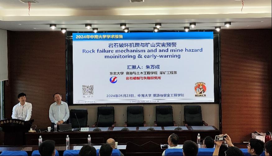 朱万成教授在报告会上就岩石损伤破裂与矿山灾害监测预警、微震监测技术、高精度微震监测系统、岩爆微震监测预警及关键调控技术、矿山岩体破裂的定位监测系统等方面进行分享,并从实际出发,让师生了解到当下矿山灾害预警监测方面的科技水平,加深对矿业行业未来发展前景的认识。