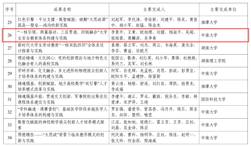 近日,2025年湖南省高等教育教学成果奖的获奖成果名单公布。由我院牵头,联合学生工作部(处)、公共管理威廉希尔官网、马克思主义威廉希尔官网等共同完成申报的《“一核引领、两翼驱动、三层贯通、四链融合”大学生安全教育体系构建与实践》教学成果脱颖而出,荣获省级特等奖,实现我院在省级教学成果奖新突破,彰显了我院在大学生安全教育教学与实践方面的显著成效和实力。